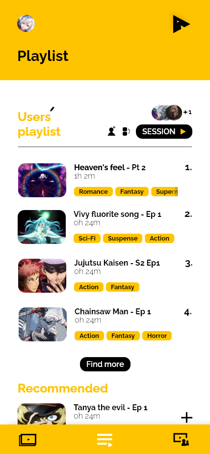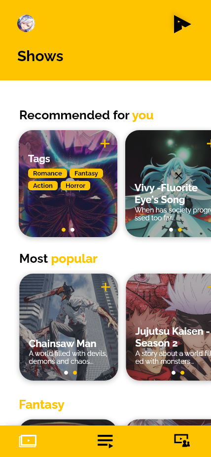 My inspiration for this design was cruncyroll, a only web based anime platform where users can watch their favorite anime shows in an accessible overview. In my experience I've always had an issue with being able to keep track of the anime I watch, thus I've designed this app with that in mind. With Aniplay you're able to see all currently airing anime, and make a playlist of episodes. Your very own anime to do list, where you can watch all anime you've been wanting to watch.